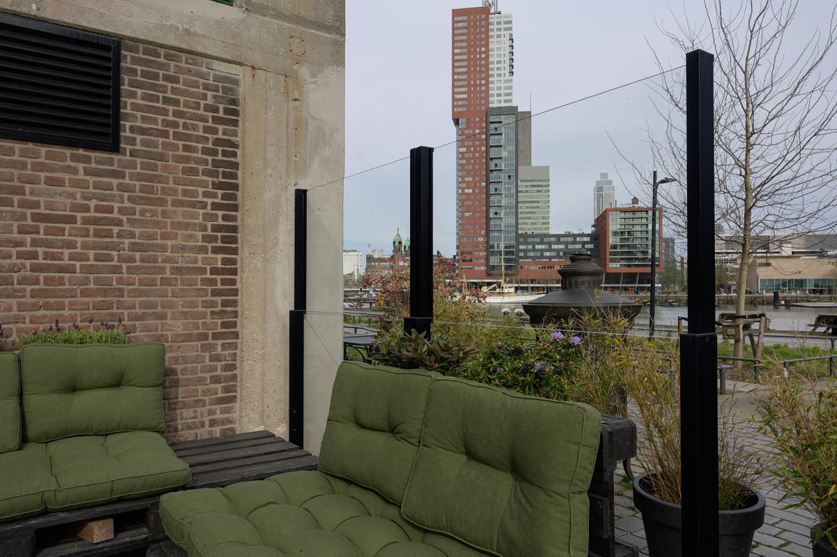 De locatie op de hoek aan de Rijnhaven vangt altijd wind, dankzij de inschuifbare windschermen genieten gasten lekker uit de wind van het spectaculaire uitzicht op de iconische skyline van Rotterdam.
