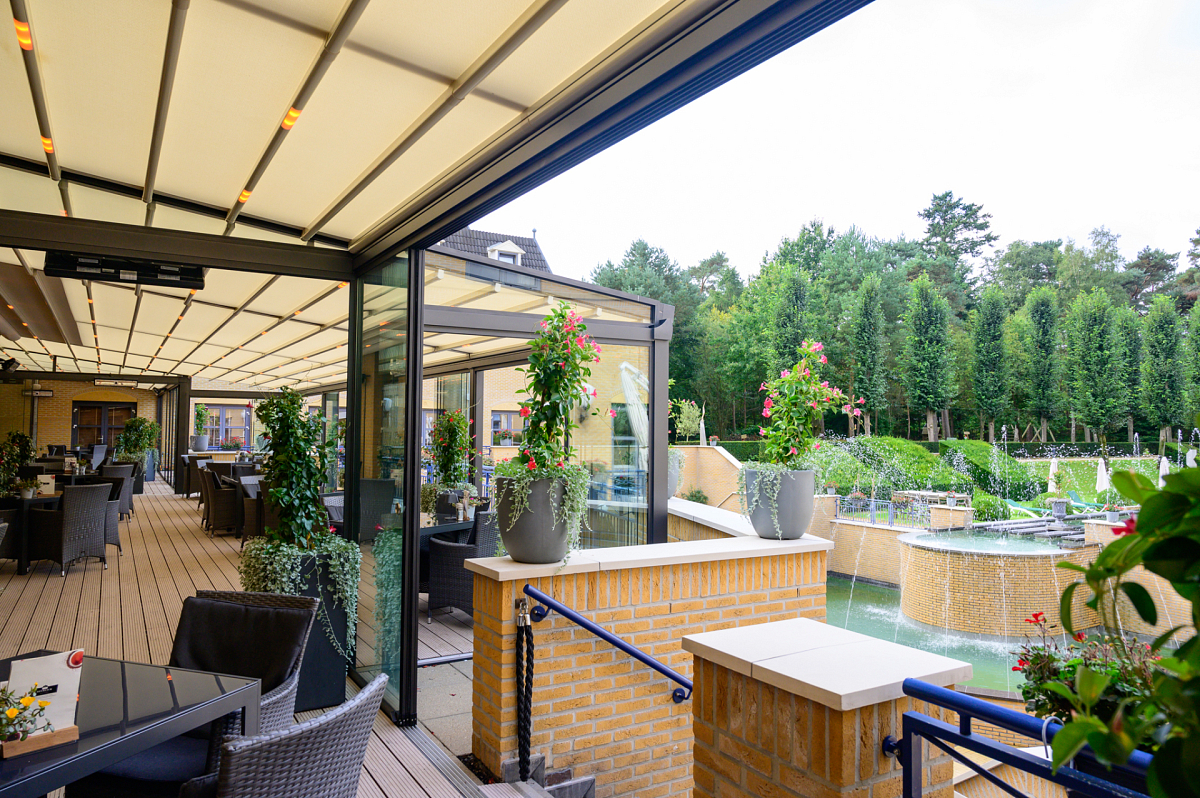 Bij het ontwerpen van de terrasoverkapping is rekening gehouden met het design van het pand en het bordes dat verspringt. De verspringing is de basis voor de segmentindeling. Per segment is het ook een optie om het vouwdak in gedeeltes in of uit te schuiven. Schaduw of zon op het terras of allebei door 1 deel van het dak in te schuiven en 1 deel uit te schuiven stellen de horecamedewerkers eenvoudig met de afstandsbediening in.